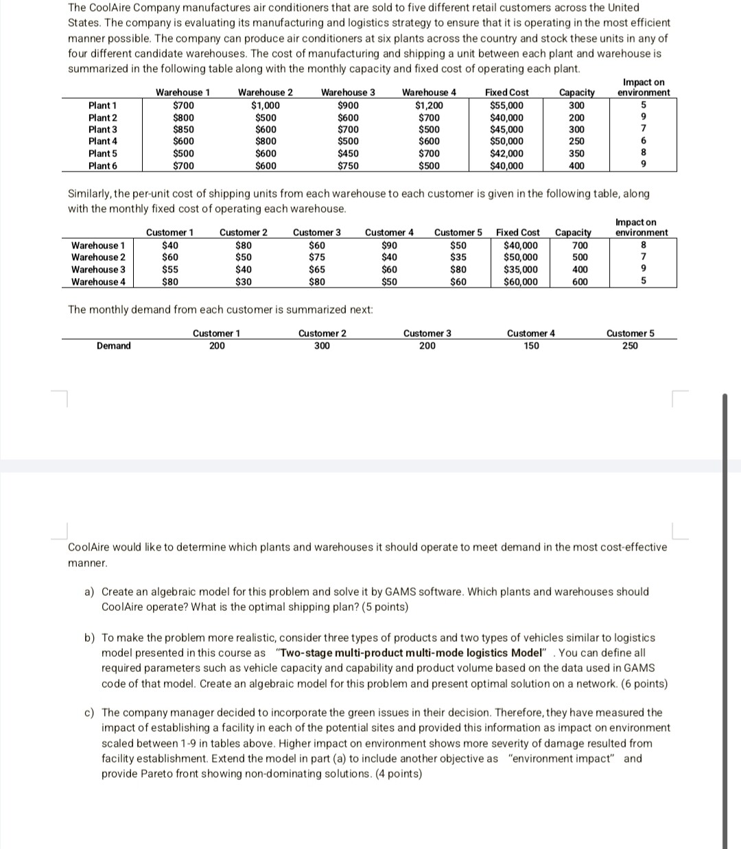 - Warehouse environmental impact \( \text{envWarehouse}_w \) = given (8,7,9,5)
